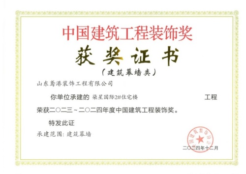 2024年12月10日,中國(guó)建筑裝飾協(xié)會(huì)在北京召開大會(huì),表彰2023~2024年度“中國(guó)建筑工程裝飾獎(jiǎng)”工程。集團(tuán)裝飾幕墻工程公司、山東鳶港裝飾工程有限公司的三項(xiàng)工程榮獲五個(gè)獎(jiǎng)項(xiàng):濰坊醫(yī)學(xué)院附屬醫(yī)院教學(xué)科研病房綜合樓(建筑幕墻類和幕墻設(shè)計(jì)類)、濰坊市婦女兒童健康中心病房樓(公共建筑裝飾類和公共建筑裝飾設(shè)計(jì)類),柒星國(guó)際2#住宅樓(建筑幕墻類)。